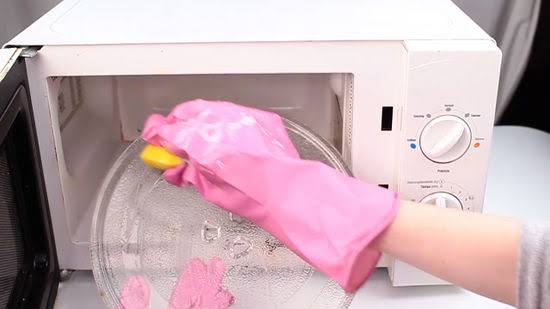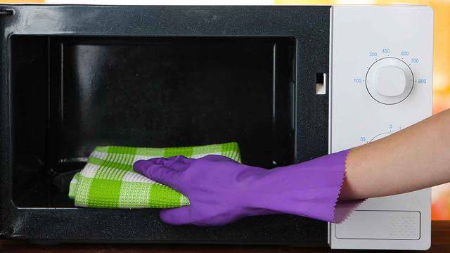 - يوزع الخليط على سطح الميكروويف باستخدام قطعة قماش مبللة.