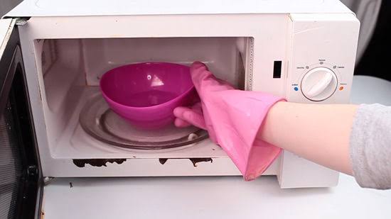 - قم بوضع نصف كوب خل أبيض مع نصف كوب ماء ويسخن في الميكروويف لمدة 3 دقائق.