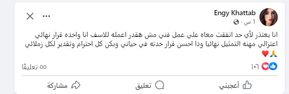 وكتبت إنجي خطاب، عبر صفحتها الرسمية بموقع فيس بوك: بعتذر لأي حد اتفقت معاه على عمل فني، مش هقدر أعمله للأسف، أنا واخدة قرار نهائي اعتزال مهنة التمثيل نهائيًا ودا أحسن قرار أخذته في حياتي.. وبكن كل احترام وتقدير لكل زملائي.