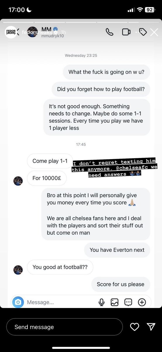 نشر أحد جماهير تشيلسي عبر مواقع التواصل الاجتماعي محادثة أجراها مع اللاعب الأوكراني ميخايلو مودريك لاعب فريق تشيلسي، حيث أجرى المشجع تلك المحادثة مع اللاعب عبر موقع إنستجرام.