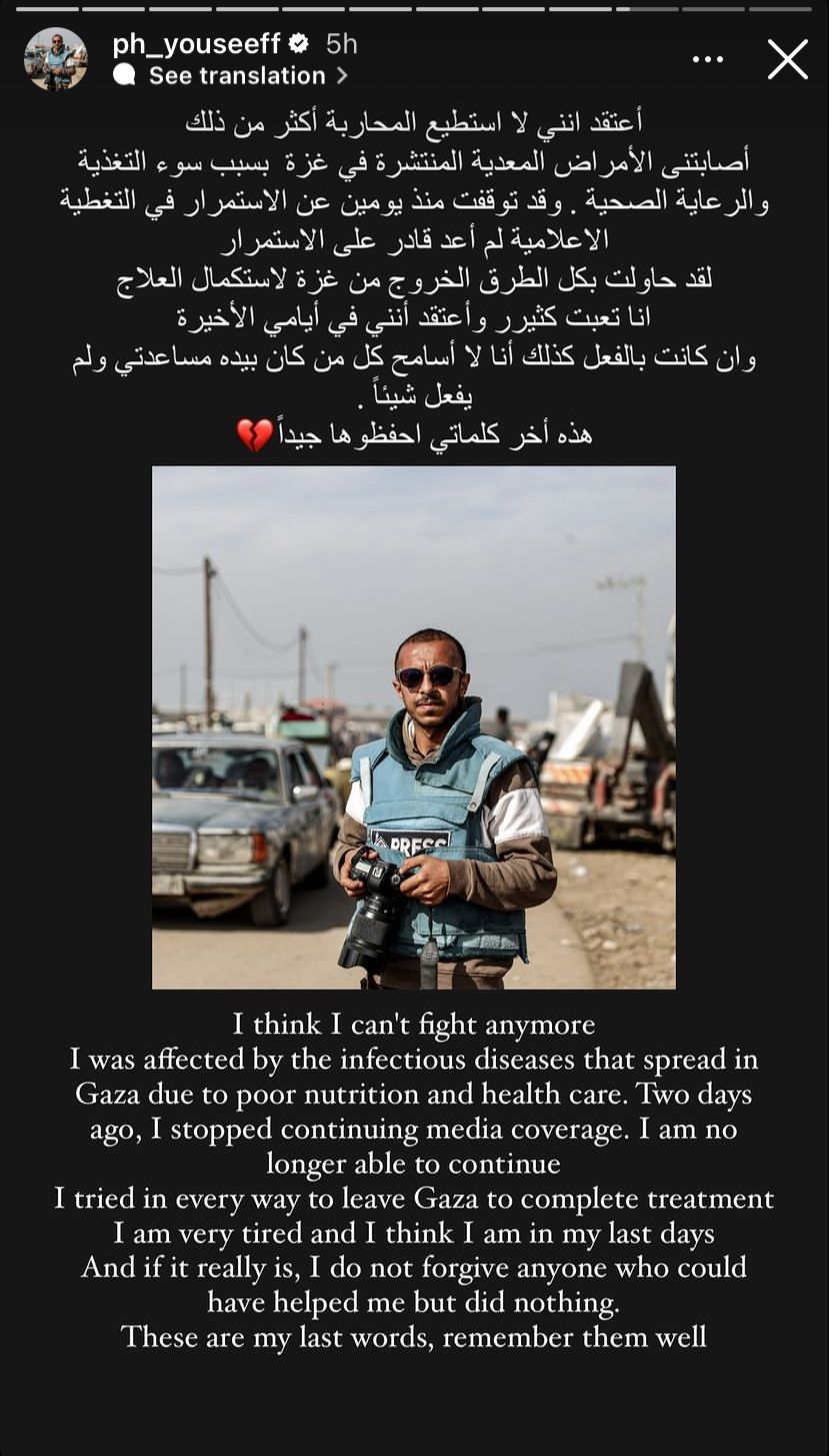 وقال الشاب الفلسطيني يوسف أبو سعيد، البالغ من العمر 26 عامًا، في منشورًا له: أعتقد أنني لا أستطيع المحاربة أكثر من ذلك، أصابتني الأمراض المعدية المنتشرة في غزة، بسبب سوء التغذية والرعاية الصحية، وقد توقفت منذ يومين عن الاستمرار في التغطية الإعلامية.