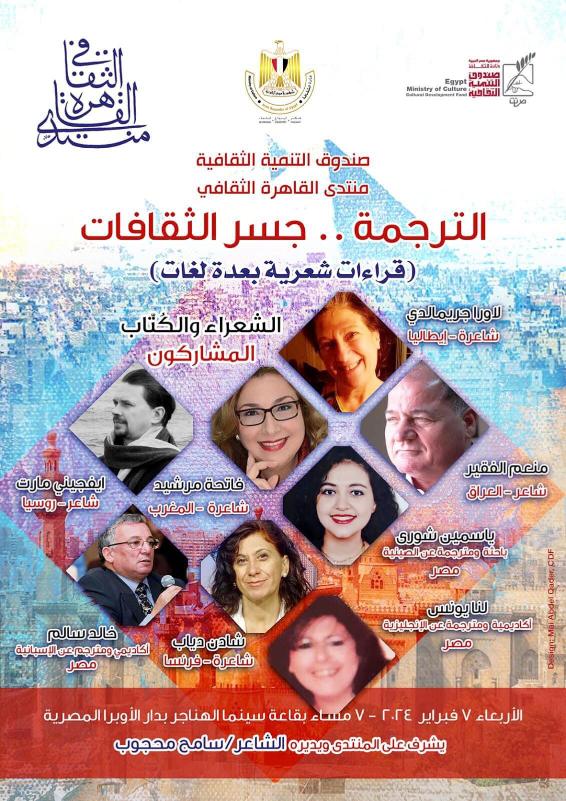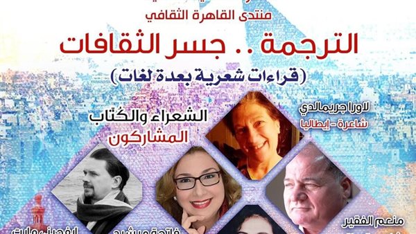 تنطلق في السابعة من مساء بعد غدٍ الأربعاء 7 فبراير، أولى فعاليات منتدى القاهرة الثقافي الذي ينظمه قطاع صندوق التنمية الثقافية برئاسة دكتور وليد قانوش، تحت عنوان الترجمة.. جسر الثقافات قراءات شعرية بعدة لغات وذلك بقاعة سينما الهناجر بساحة دار الأوبرا.