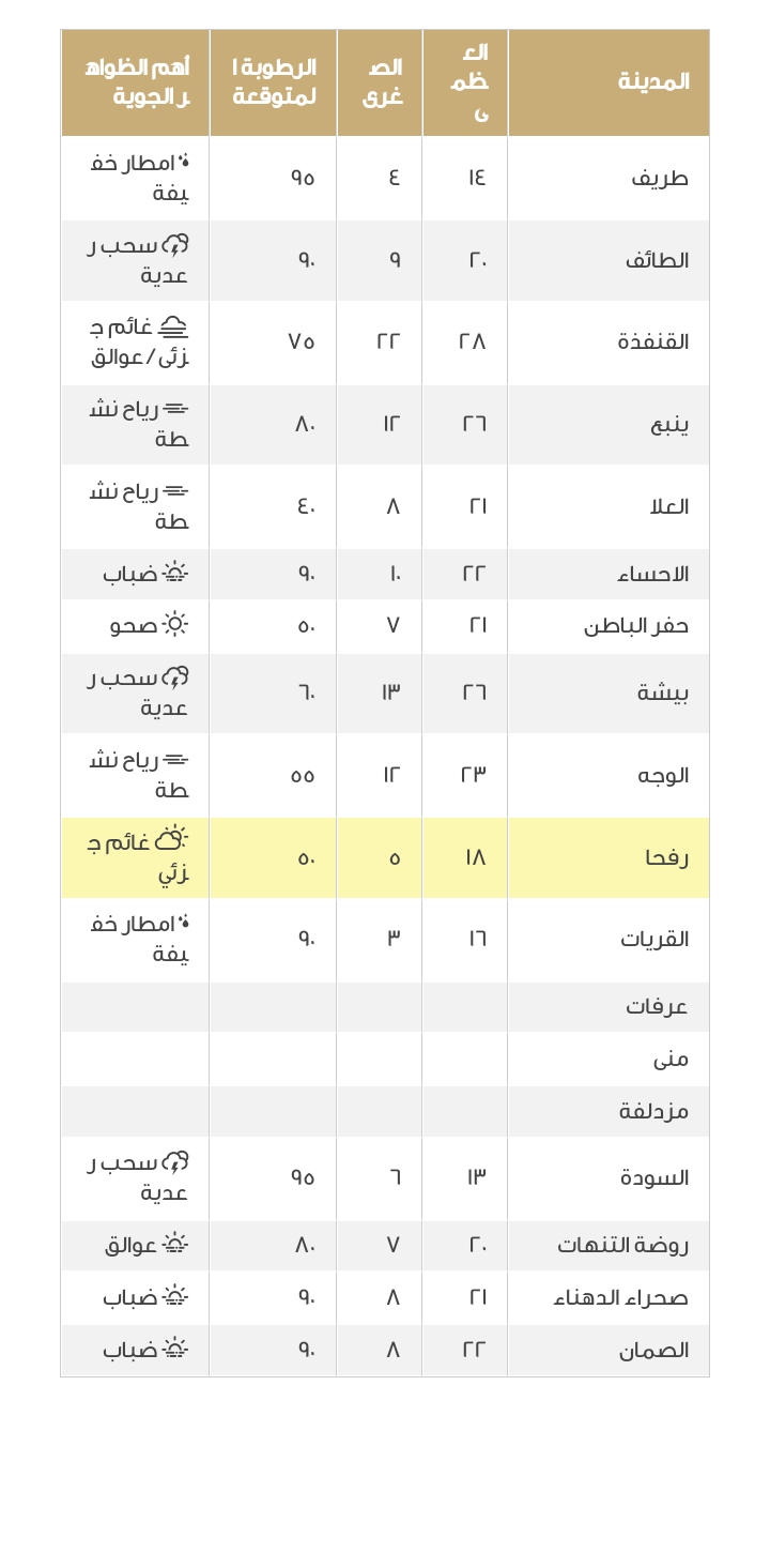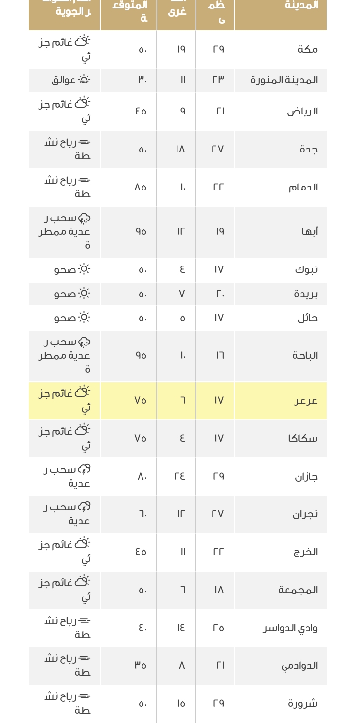 ويبرد الجو في السعودية على معظم مدن المملكة، حيث تنخفض درجات الحرارة بشكل ملحوظ على مدن حائل وسكاكا وطريف والقريات ورفحا، حيث تنخفض درجات الحرارة الصغرى إلى 5 درجات مئوية وما دونها.