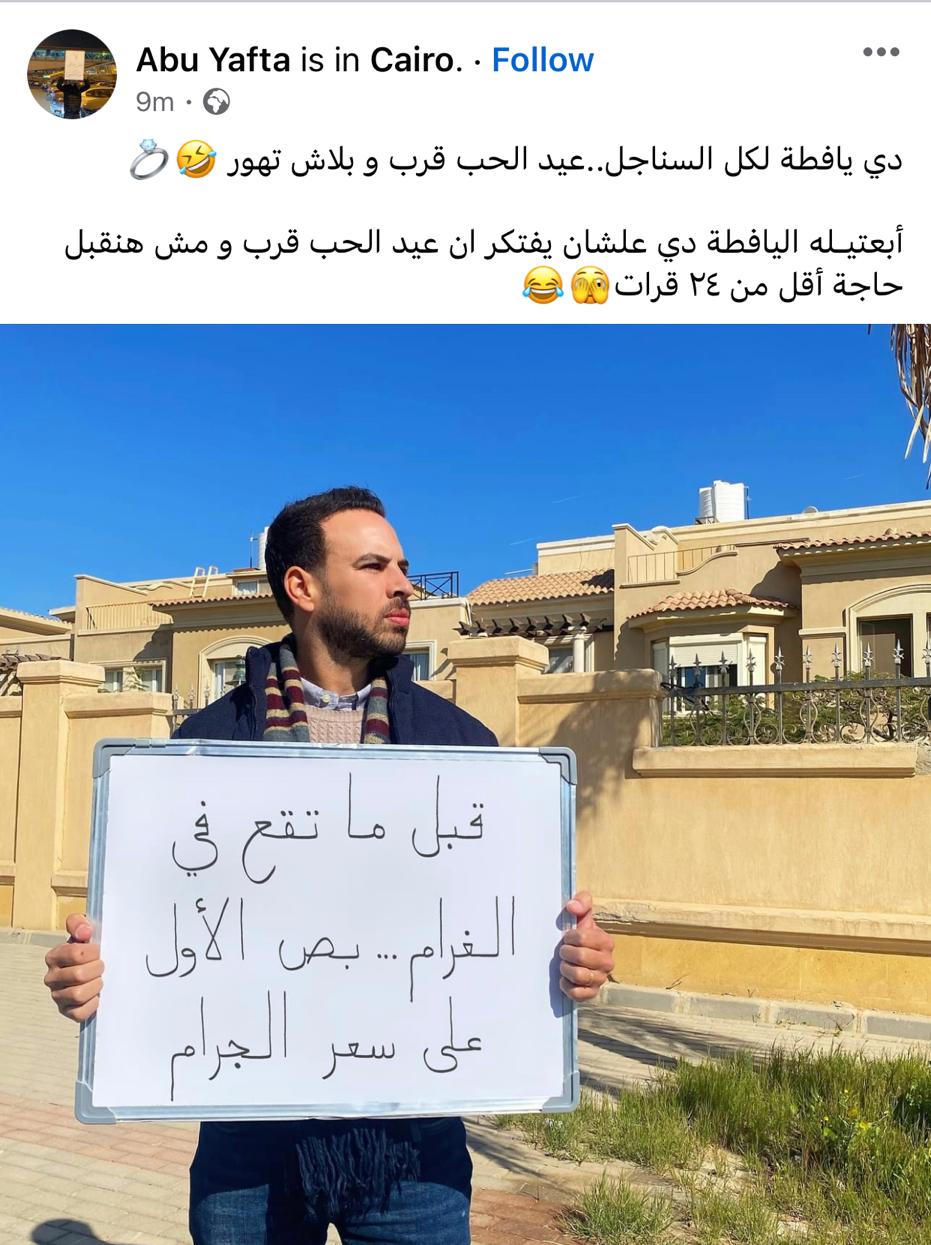 وانتشرت المنشورات مُعقبًا عليها مستخدمي المواقع، وأحدهم ينشر صورته يحمل لوحة بيضاء ويكتب عليها: قبل ما تقع في الغرام.. بص الأول على سعر الجرام، وعقب على المنشور كاتبًا: دي يافطة لكل السناجل.. عيد الحب قرب وبلاش تهور.. ابعتيله اليافطة دي عشان يفتكر أن عيد الحب قرب ومش هنقبل حاجة أقل من 24 قيراط، ومستخدمين آخرون ينشروا: قبل ما تقع في الغرام.. اعرف سعر الجرام.