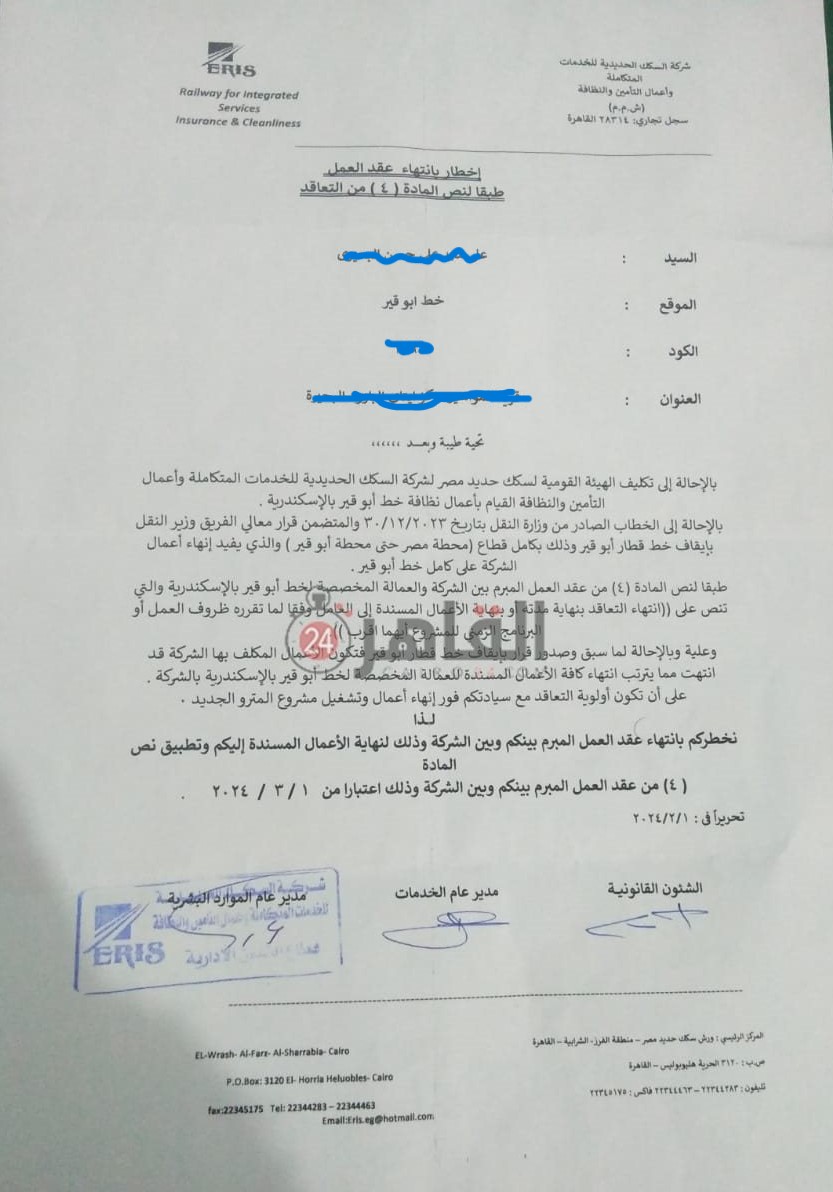 وحصل القاهرة 24 على نسخة من إخطار أحد العاملين بانتهاء عقد عمله داخل الشركة، والذي نص على أن هذا القرار يأتي بالتزامن مع إيقاف الحركة داخل خط قطار أبو قير بكامل قطاع (محطة مصر حتى محطة أبو قير) والذي يفيد بإنهاء أعمال الشركة على كامل خط أبو قير تنفيذًا لأعمال تحويل هذه الخط إلى شبكة مترو أنفاق.