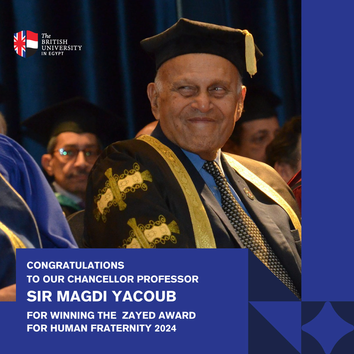 حرصت الجامعة البريطانية في مصر، على تهنئة البروفيسور السير مجدي يعقوب، الرئيس الشرفي للجامعة وذلك بعد حصوله على جائزة الشيخ زايد للأخوة البشرية 2024.