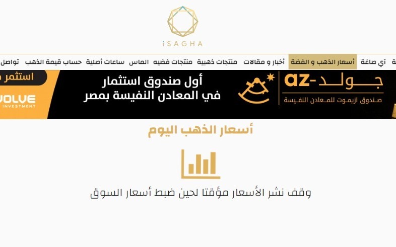 أوقفت منصة آي صاغة لتداول الذهب والمجوهرات عبر الإنترنت، نشر أسعار الذهب، اليوم الأربعاء 7-2-2024، وذلك رغم إعلانها الأسعار منذ بداية اليوم.