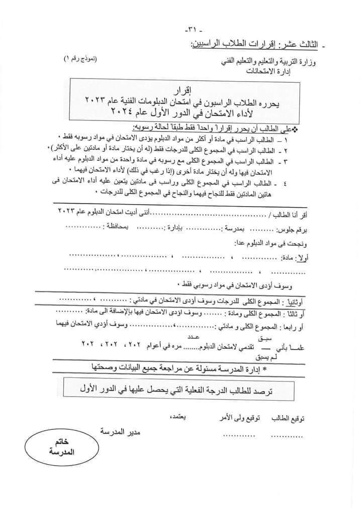 وأضافت وزارة التربية والتعليم، في خطاب رسمي، أنه على الطالب الراسب في امتحانات الدبلومات الفنية 2023 أن يحرر إقرارا واحدا فقط طبقا لحالة رسوبه: