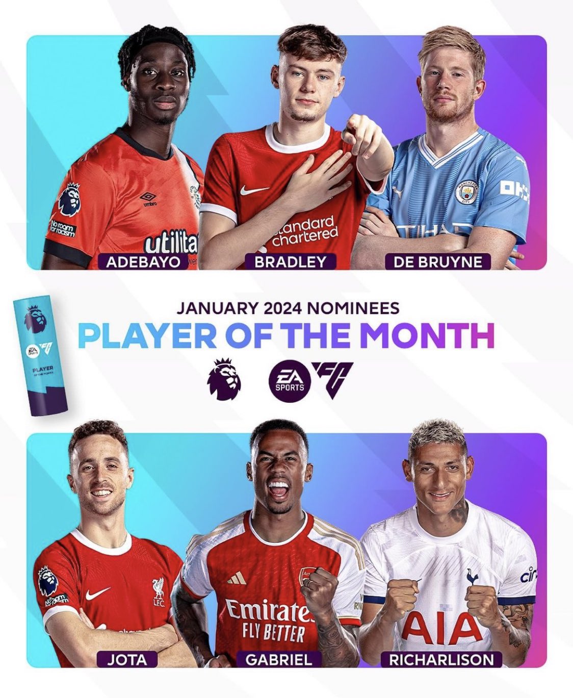 وينافس في قائمة المرشحين لجائزة أفضل لاعب بالدوري الإنجليزي، عن شهر يناير الماضي: كيفين دي بروين لاعب مانشستر سيتي، أديبايو لاعب لوتون تاون بالإضافة إلى البرازيلي ريتشارليسون مهاجم توتنهام.