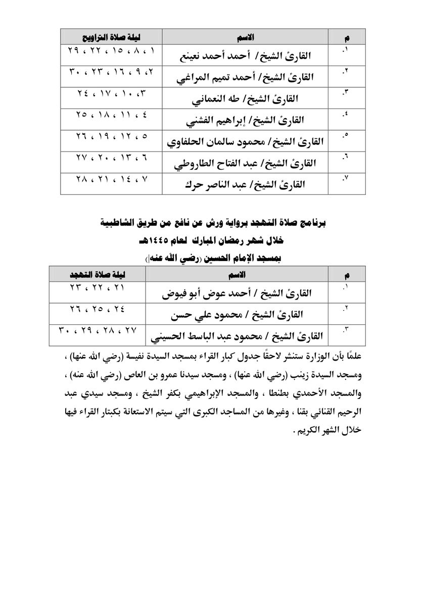 وقالت وزارة الأوقاف في بيان لها: في إطار عناية وزارة الأوقاف بالشهر الكريم، يسرنا أن ننشر بيانًا بشأن كبار القراء الذين سيؤمون المصلين بمسجد الإمام الحسين رضي الله عنه، في صلاة التراويح وصلاة التهجد، والليالي المخصصة لكل منهم، وذلك على النحو التالي: