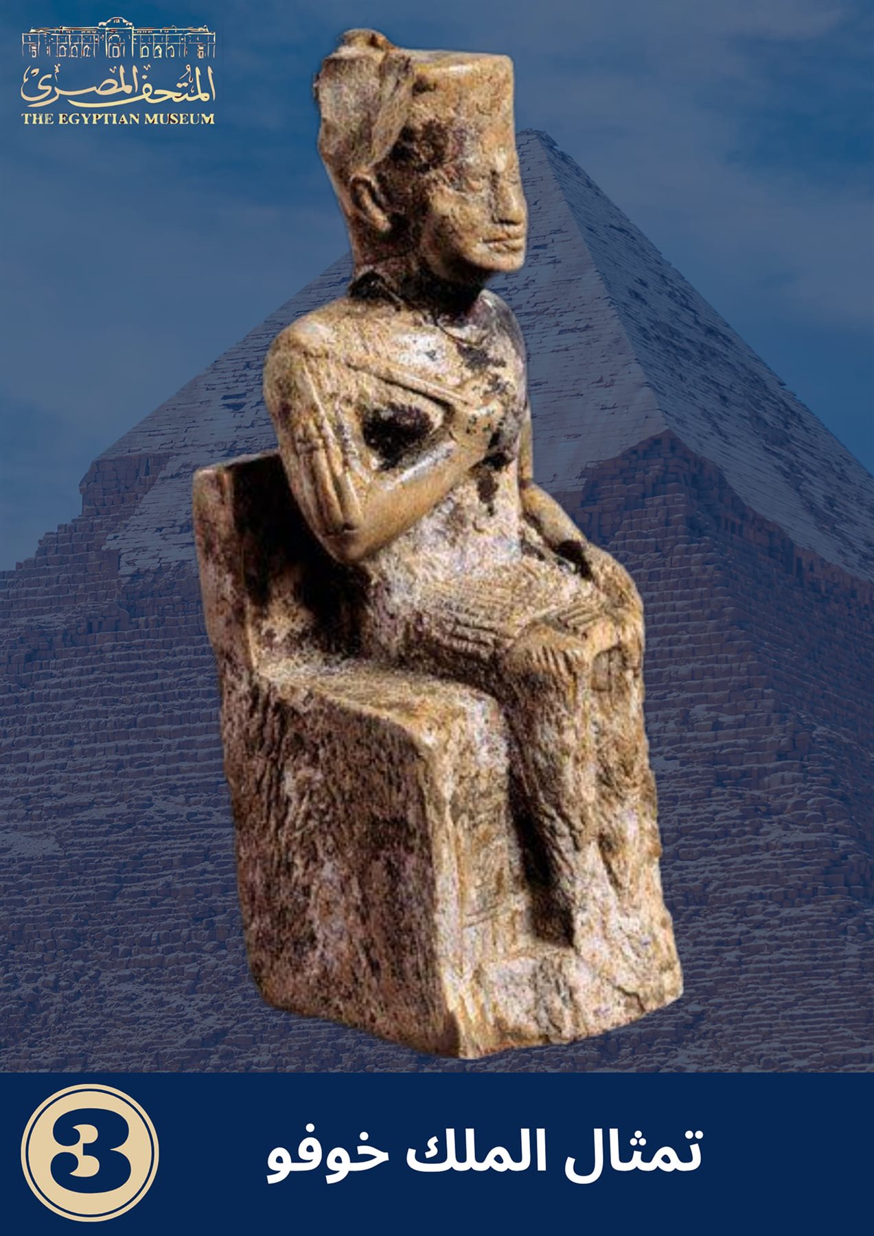ألقت إدارة المتحف المصري بالتحرير، الضوء على تمثال الملك خوفو صاحب الهرم الأكبر بالجيزة والذي عثر عليه في منطقة أبيدوس في حفائر بعثة جمعية استكشاف مصر برئاسة السير وليام فلندرز الإنجليزي عالم الآثار الفرنسي، وهو يصور الملك خوفو صاحب الهرم الأكبر بالجيزة.