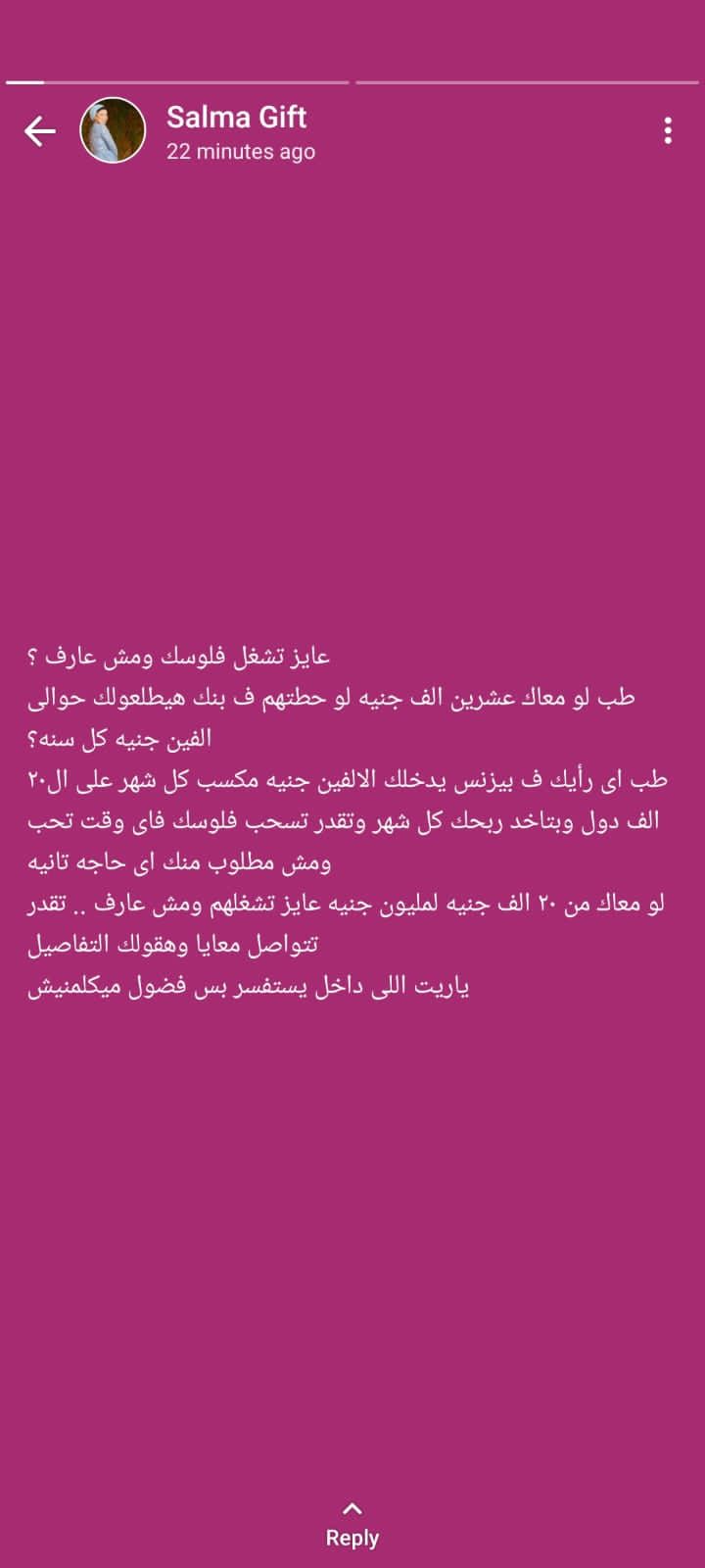 وقالت ناهد ضحية البلوجر سلمي الغزولي، في تصريحات لـ القاهرة 24، إنها تعرفت على المتهمة سلمى الغزولي عن طريق صفحتها الشخصية بموقع التواصل الاجتماعي انستجرام، التي تحوي ملايين المتابعين، وتفاجئن بإعلان للغزولي تعلن فيه عن تشغيل أموال متابعيها، قائلة: عايز تشغل فلوسك ومش عارف؟ طب لو معاك عشرين ألف جنيه لو حطتهم في بنك هيطلعوا لك حوالي ألفين جنيه كل سنه؟ طب أي رأيك ف بيزنس يدخلك الألفين جنيه مكسب كل شهر، على الـ 20 ألف دول، وبتاخد ربحك كل شهر وتقدر تسحب فلوسك في أوقت تحب ومش مطلوب منك أي حاجه تانية، لو معاك من 20 ألف جنيه لمليون جنيه عايز تشغلهم ومش عارف، تقدر تتواصل معايا وهقول لك التفاصيل ياريت اللى داخل يستفسر بس فضول ميكلمنيش، لكن إعلانها قوبل بالرفض من قبل المتابعين، الذين هاجموها بشدة، واتهموها بالربح من الربا، لتوقف الإعلانات وتسافر إلى السعودية لأداء مناسك العمرة.