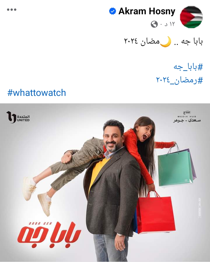 نشر أكرم حسني البوستر الرسمي لمسلسل بابا جه، عبر حسابه الشخصي بموقع فيسبوك وعلق عليه قائلًا: بابا جه رمضان 2024، وظهر فيه وهو يحمل طفلته على كتفيه وبيدها حقيبة.