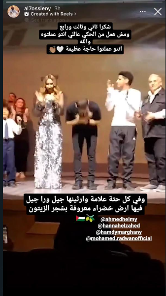 وحرص أحمد حلمي على تقديم أغنية خلال أحداث المسرحية داعمًا من خلالها فلسطين، حيث نشر أحد الحضور عبر حسابه على السوشيال ميديا مقطعًا من الأغنية، ويقول خلالها أحمد حلمي، الآتي: كورة دايرة بينا من زمن طويل، وفي كل حتة علامة وارثينها جيل ورا جيل فيها أرض خضراء معروفة بشجر الزيتون.