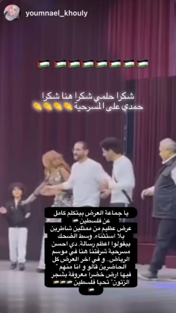 بينما أشادت فتاة حضرت العرض المسرحي بدعم المسرحية لفلسطين، وكتبت عبر حسابها الآتي: يا جماعة العرض بيتكلم كامل عن فلسطين، عرض عظيم من ممثلين شاطرين بلا استثناء، وسط الضحك بيقولوا أعظم رسالة، ديه أحسن مسرحية شرفتنا هنا في موسم الرياض، وآخر العرض كل الحاضرين قالوا وأنا منهم "فيها أرض خضراء معروفة بشجر الزيتون.. تحيا فلسطين.