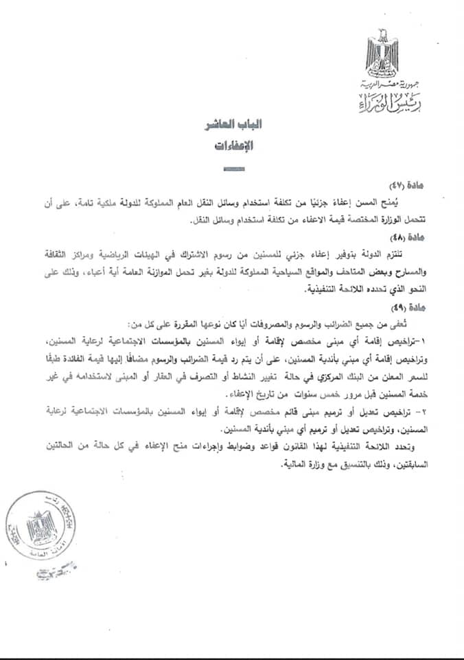كما أعفى مشروع قانون المسنين من جميع الضرائب والرسوم والمصروفات أيا كان نوعها المقررة على كل من:
