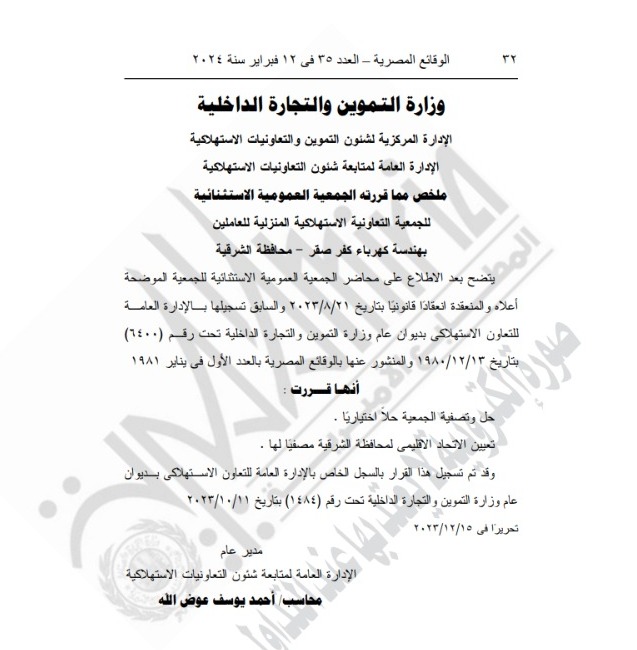 وقالت الجريدة الرسمية، أنه بعد الاطلاع على محاضر الجمعية العمومية الاستثنائية للجمعية الموضحة أعلاه والمنعقدة انعقادًا قانونيًا بتاريخ 21-8-2023 والسابق تسجيلها بالإدارة العامة للتعاون الاستهلاكي بديوان عام وزارة التموين والتجارة الداخلية رقم 6400 بتاريخ 13-12-1980 والمنشور عنها بالوقائع المصرية بالعدد الأول في يناير 1981.