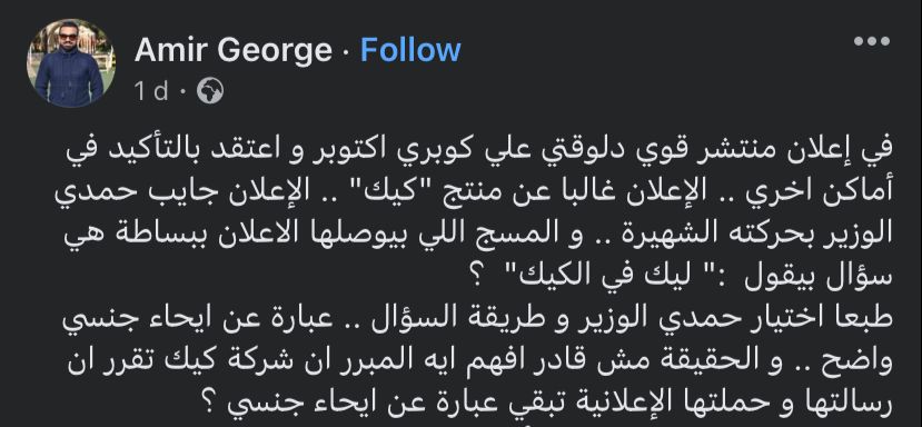 وكتب أمير جيرجو، منشورًا له عبر موقع فيسبوك، ساخرًا من الإعلان، في إعلان منتشر قوي دلوقتي على كوبري أكتوبر، واعتقد بالتأكيد في أماكن أخرى، الإعلان غالبًا عن منتج كيك، جايب حمدي الوزير بحركته الشهيرة، والمسج اللي بيوصلها الإعلان ببساطة هي سؤال بيقول ليك في الكيك؟.. وطبعا اختيار حمدي الوزير وطريقة السؤال عبارة عن إيحاء جنسي واضح.. والحقيقة مش قادر افهم إيه المبرر إن شركة كيك تقرر أن رسالتها وحملتها الإعلانية تبقي عبارة ده؟.