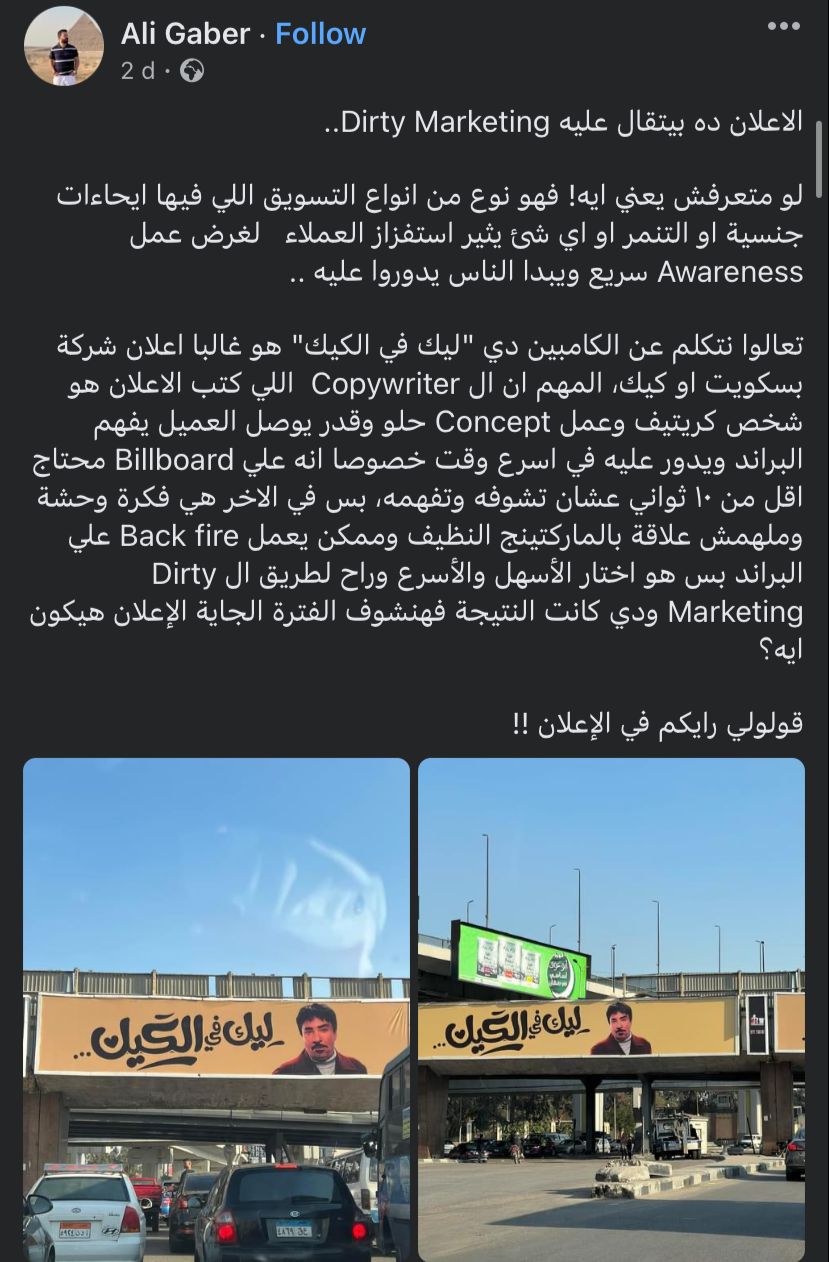 ونشر آخر عبر صفحته الشخصية بموقع فيسبوك، الاعلان ده بيتقال عليه Dirty Marketing.. لو متعرفش يعني ايه! فهو نوع من أنواع التسويق اللي فيها إيحاءات جنسية أو التنمر، أو أي شئ يثير استفزاز العملاء، لغرض عمل Awareness سريع ويبدأ الناس يدوروا عليه، تعالوا نتكلم عن الكامبين دي ليك في الكيك هو غالبًا إعلان شركة بسكويت او كيك، المهم ان الـ Copywriter اللي كتب الإعلان هو شخص كريتيف وعمل Concept حلو وقدر يوصل العميل يفهم البراند ويدور عليه في أسرع وقت، خصوصا أنه على Billboard محتاج اقل من 10 ثواني عشان تشوفه وتفهمه، بس في الأخر هي فكرة وحشة وملهمش علاقة بالماركتينج النظيف، وممكن يعمل Back fire على البراند، بس هو اختار الأسهل والأسرع وراح لطريق الـ Dirty Marketing، ودي كانت النتيجة وهنشوف الفترة الجاية الإعلان هيكون ايه.