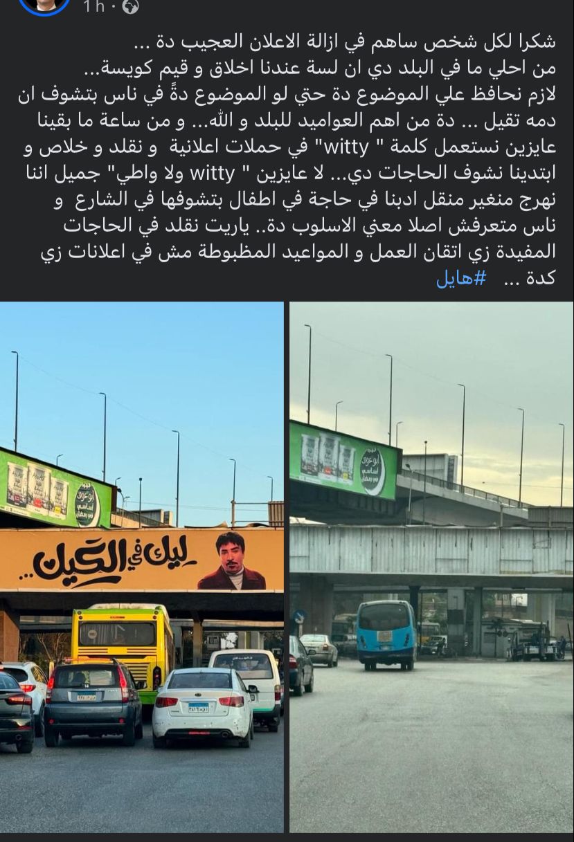 وتابع صاحب المنشور، لازم نحافظ علي الموضوع ده حتي لو في ناس بتشوف إن دمه تقيل..، ده من أهم العواميد للبلد والله، ومن ساعة ما بقينا عايزين نستعمل كلمة witty في حملات إعلانية ونقلد وخلاص وابتدينا نشوف الحاجات دي، لا عايزين witty ولا واطي، جميل إننا نهرج من غير ما نقل أدبنا في حاجة الأطفال بتشوفها في الشارع، وناس متعرفش معنى الأسلوب دا.. ياريت نقلد في الحاجات المفيدة، زي إتقان العمل والمواعيد المضبوطة مش في إعلانات زي كده.