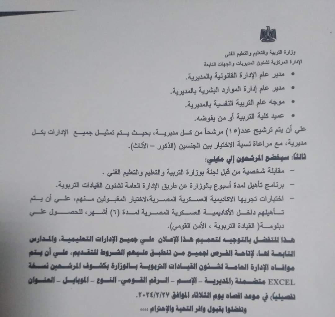 ووجهت الإدارة المركزية لشئون المديريات بضرورة تعميم هذا الإعلان علي جميع الإدارات التعليمية، والمدارس التابعة لها، لإتاحة الفرص لجميع من تنطبق عليهم الشروط للتقديم، علي أن يستم موافاه الإدارة العامة لشئون القيادات التربوية بالوزارة بكشوف المرشحين نسخة EXCEL متضمنة المديرية - الإسم - الرقم القومي - النوع - الموبايل - العنوان تفصيليا، في موعد اقصاه يوم الثلاثاء الموافق 27 فبراير الجاري.