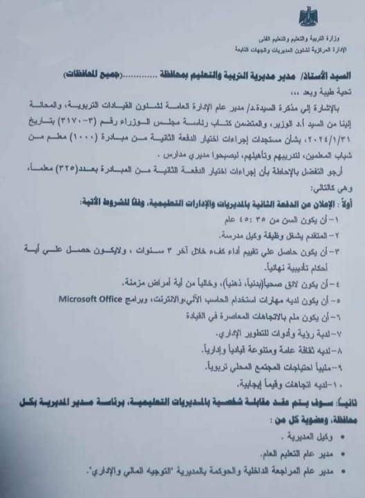 خاطبت الإدارة المركزية لشئون المديريات بوزارة التربية والتعليم والتعليم الفني، جميع المديريات بكافة أنحاء الجمهورية، بضرورة ترشيح 15 من كل مديرية تعليمية، للحصول على دبلومة “القيادة التربوية والأمن القومي”، وذلك مع مراعاة نسبة الاختيار بين الجنسين الذكور - الأناث، وذلك ضمن مبادرة 1000 معلم من شباب المعلمين لتدريبهم وتأهيلهم، ليصبحوا مديري مدارس.