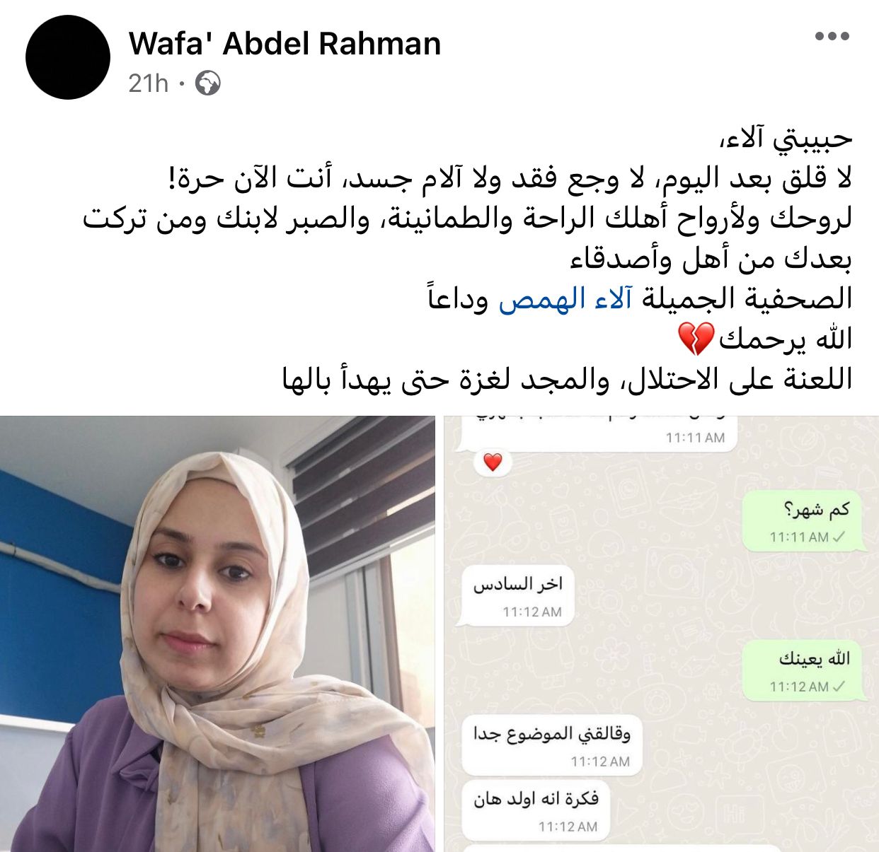 وآثار استشهاد هذه البطلة حزن الجميع، ولكن قامت صديقة لها بمشاركة منشور عبر حساب باسم وفاء عبدالرحمن على فيسبوك لتقدم التعازي لها، قائلة: حبيبتي آلاء..لا قلق بعد اليوم.. لا وجع فقد ولا آلام جسد..أنت الآن حرة..لروحك ولأرواح أهلك الراحة والطمأنينة..والصبر لابنك ومن تركت بعدك من أهل وأصدقاء..الصحفية الجميلة آلاء الهمص وداعًا..الله يرحمك..اللعنة على الاحتلال، والمجد لغزة حتى يهدأ بالها.