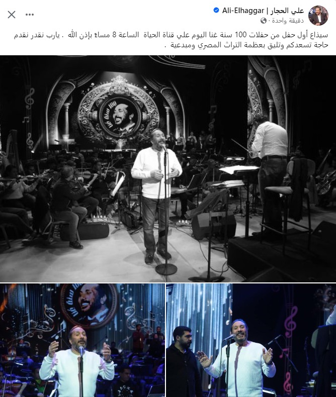 وكتب علي الحجار منشورًا، عبر حسابه الشخصي بموقع التواصل الاجتماعي فيسبوك، قال فيه: سيذاع أول حفل من حفلات 100 سنة غٌنا اليوم على قناة الحياة، الساعة 8 مساءً بإذن الله، يا رب نقدر نقدم حاجة تسعدكم، وتليق بعظمة التراث المصري ومبدعيه.