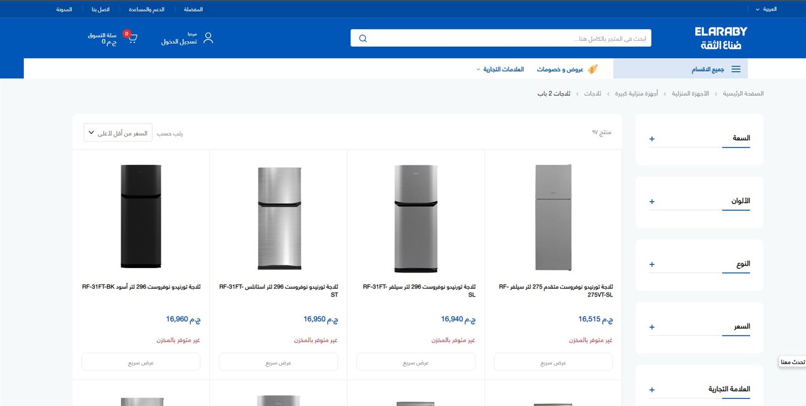 وأظهرت بيانات موقع شركة توشيبا نفاد جميع أصناف الثلاجات، وكذلك لا تتوافر منتجات شركة العربي في السوق.