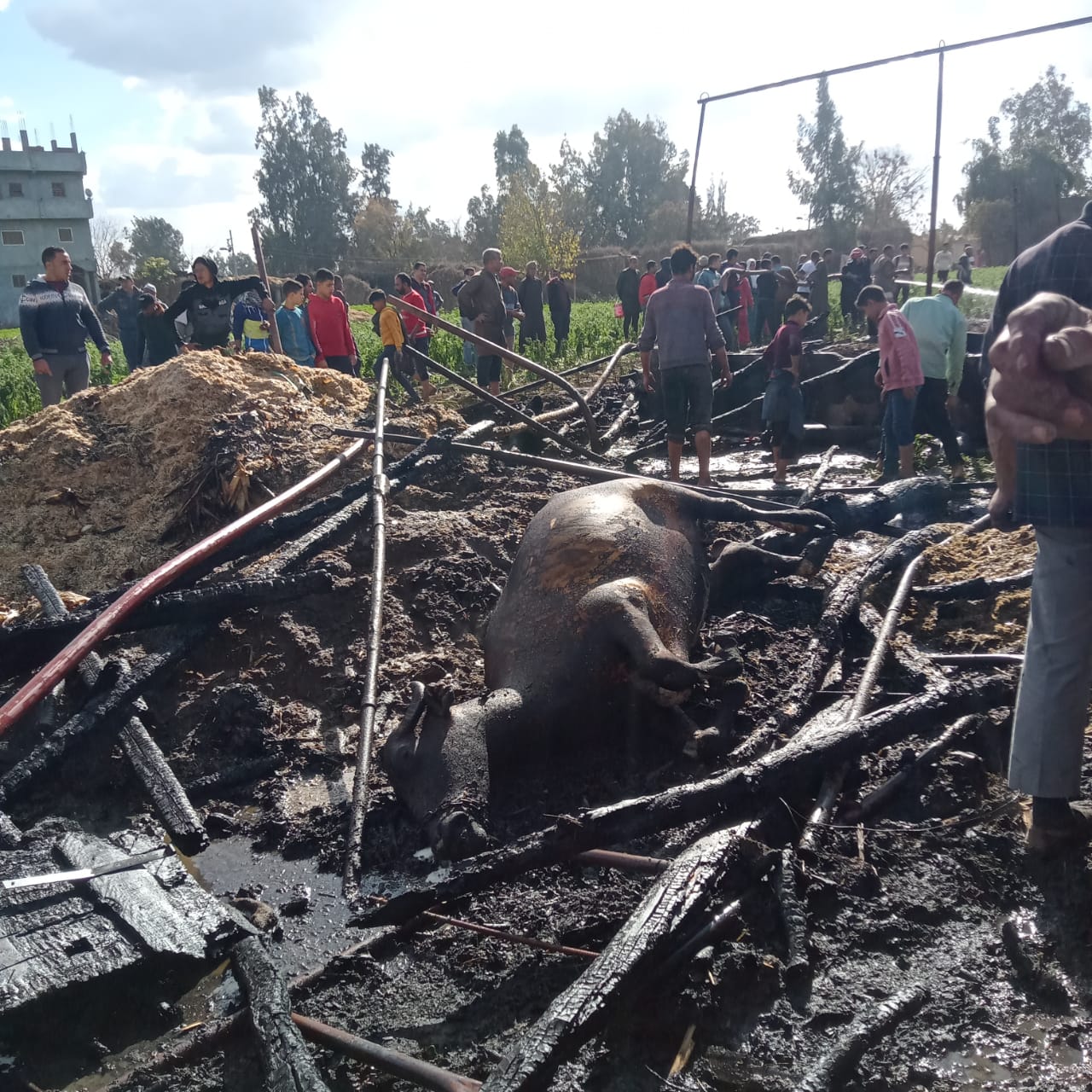 وتبين من الفحص والمعاينة تبين امتداد النيران الي عدد من الحظائر والعشش ومخلفات قش الأرز بمساحات كبيرة أدت إلى نفوق نحو 5 رؤس ماشية واصابة 6 رؤس ماشية آخرين بحروق بالغة مابين ابقار وجاموس واحد الخيول وتلفيات بجهاز ليزر لتخطيط الأرض الزراعية وماكينة سلاج وماكينة ري واحدي العربات الحديدية وماكينة ري واحد الجرارات الزراعية واحتراق عدد من الألواح والأبواب الخشبية بأحد المنازل بالإضافة إلى احتراق أسقف عدد من الحظائر والعشش و4 دراجات نارية و4 اطارات لاحد الجرارات الزراعية، وتم نقل 4 مصابين باختناقات الي المستشفى