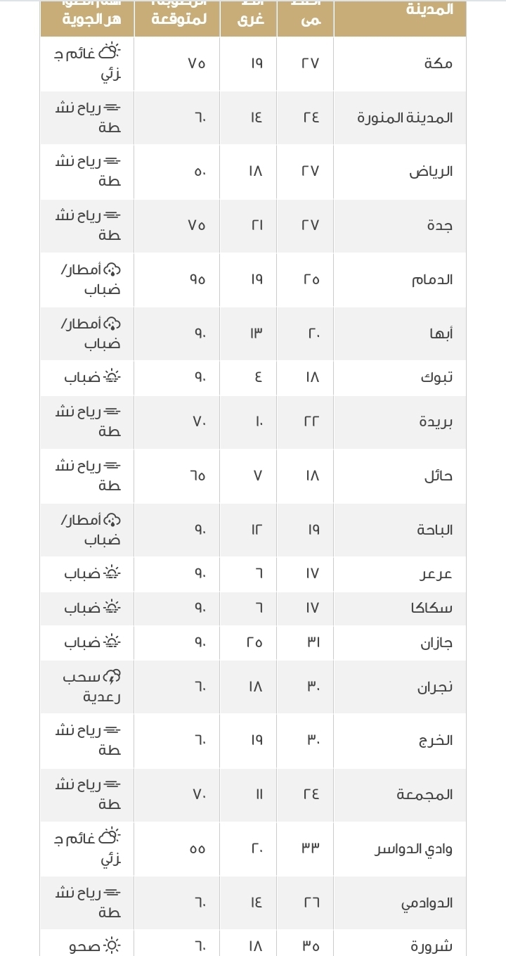 وفيما يلي درجات الحرارة في السعودية العظمى والصغرى ونسبة الرطوبة وحالة الطقس وفقا للنشرة الجوية الصادرة عن المركز الوطني للأرصاد: