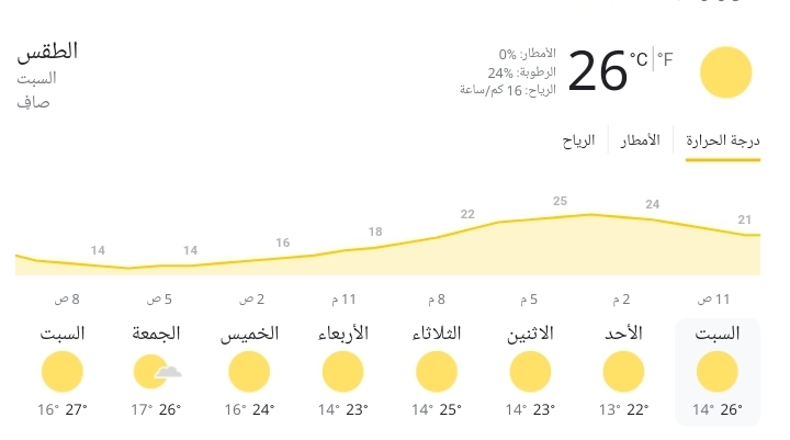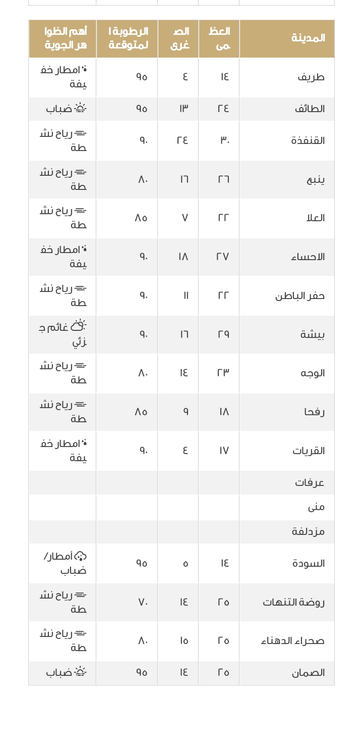 أما حالة الطقس الرياح، فتنشط الرياح المثيرة للغبار، وتكون درجة الحرارة العظمى 27 درجة مئوية أما الصغرى 18 درجة مئوية، والرطوبة العظمى 50%.
