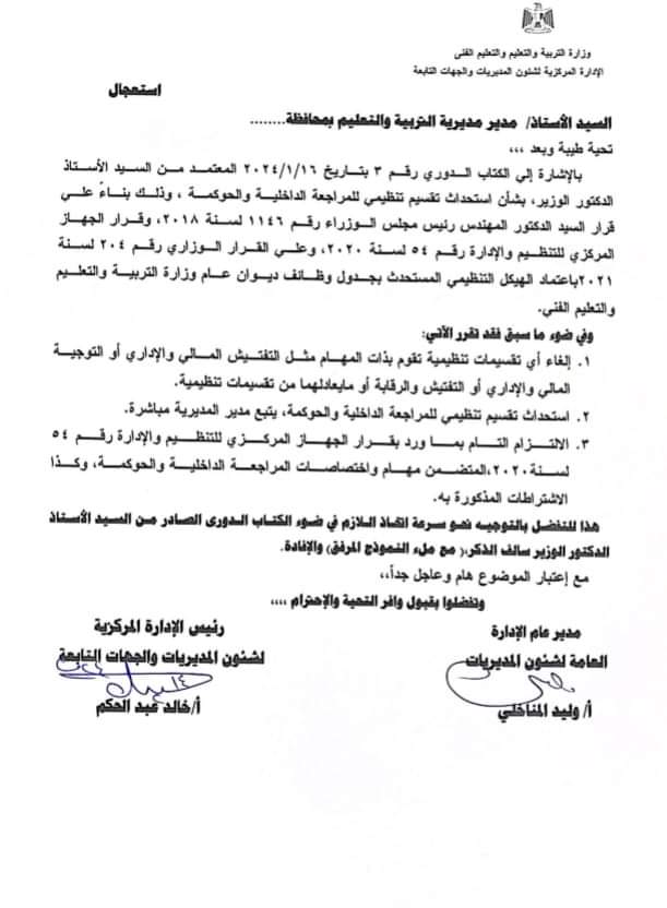 خاطبت الإدارة المركزية لشئون المديريات بوزارة التربية والتعليم والتعليم الفني، المديريات التعليمية التابعة لها مختلف محافظات الجمهورية، باستعجال إلغاء التوجيه المالي والإداري واستحداث المراجعة الداخلية والحوكمة والالتزام بالاختصاصات والاشتراطات.