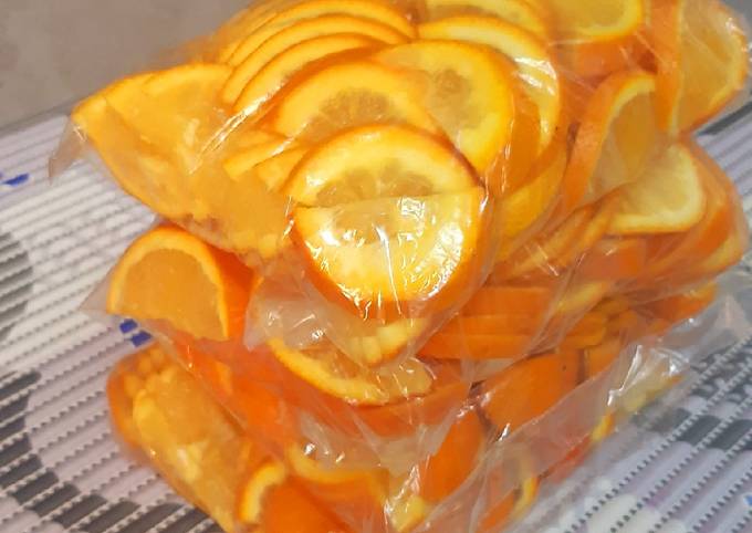 ما زال موسم البرتقال مشتعلا بأجود أنواع البرتقال في السوق وخاصة مع سعره المناسب، لذلك اقتني كمية كبيرة من البرتقال، واغسلي الثمرة جيدًا بالماء ثم قشريها وقطعيها شرائح عرضية سميكة أو احتفظي به في أكياس في الفريزر كفصوص أو ثمرة مقشرة دون تفصيصها أو تقطيعها.