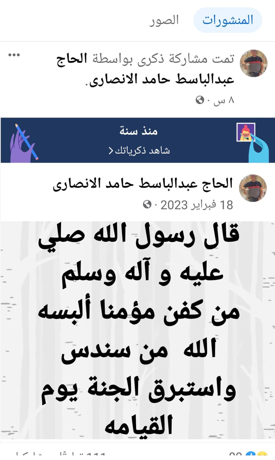من كفَّن مؤمنا ألبسه الله من سندس وإستبرق الجنة.. آخر منشورات شيخ قبيلة الأنصار بقنا قبل وفاته بساعات