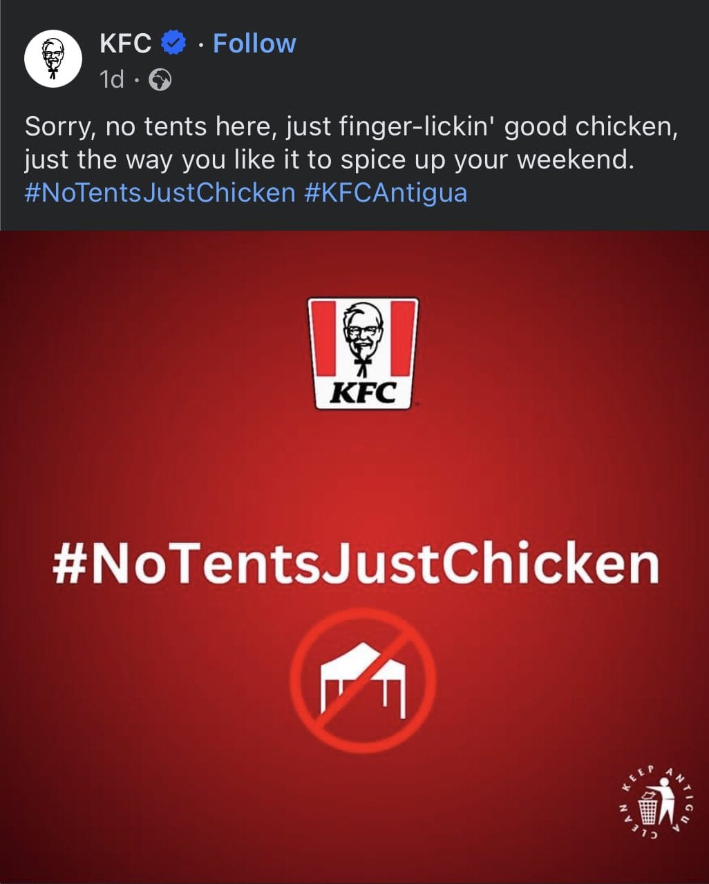 تصدر منشور على الصفحة الرسمية لسلسلة مطاعم المأكولات الشهيرة كنتاكي التريند، لما فيه من التباس، حيث يزعم متابعو وسائل التواصل الاجتماعي أن سلسلة المطاعم الشهيرة استخدمت الحرب الإسرائيلية على غزة كطريقة دعائية ساخرة، بسبب التعليق التي وضعته كنتاكي على صورة تضمن هاشتاج يحمل عبارة: لا خيام هنا، فقط دجاج.. ليتضح أن القصة الحقيقية وراء المنشور لها علاقة بجزيرة صغيرة تسمى أنتيجوا.