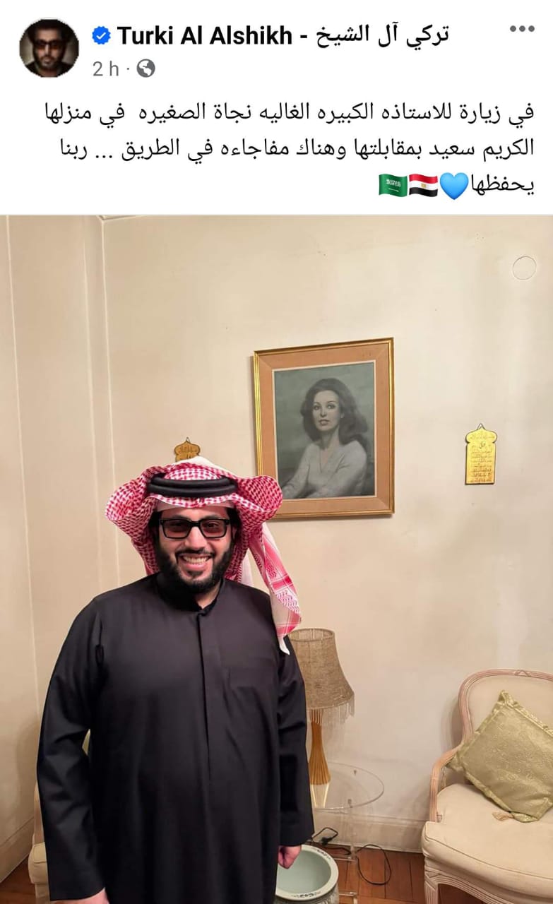 ونشر تركي آل الشيخ، صورة له من داخل منزل الفنانة نجاة الصغيرة، عبر حسابه الشخصي بموقع التواصل الاجتماعي فيسبوك، وكتب: في زيارة للأستاذة الكبيرة الغالية نجاة الصغيرة في منزلها الكريم، سعيد بمقابلتها وهناك مفاجأة في الطريق.. ربنا يحفظها.