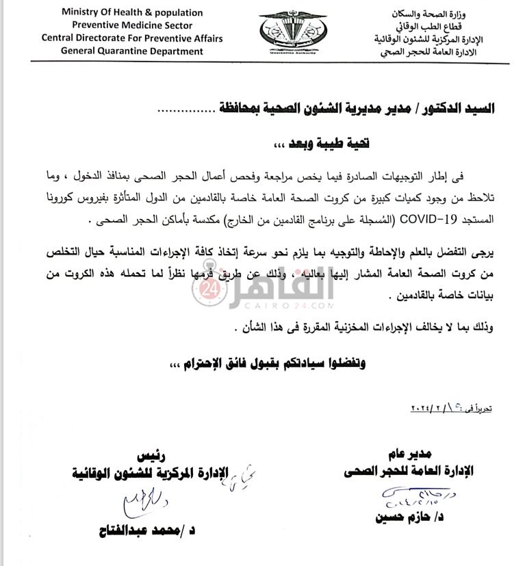 وفقا لخطاب حصل القاهرة 24 عليه، وجهت وزارة الصحة أقسام الحجر الصحي بالتخلص من كروت الصحة العامة للقادمين من الدول المتأثرة بفيروس كورونا، والمسجلة على برنامج القادمين من الخارج، بطريقة الفرم، نظرا لتكدسها بأماكن الحجر الصحي وما تحملة من بيانات خاصة بالقادمين.
