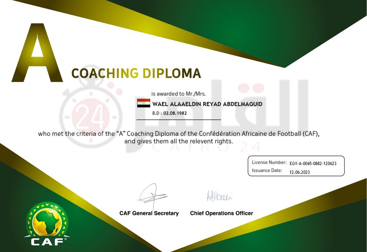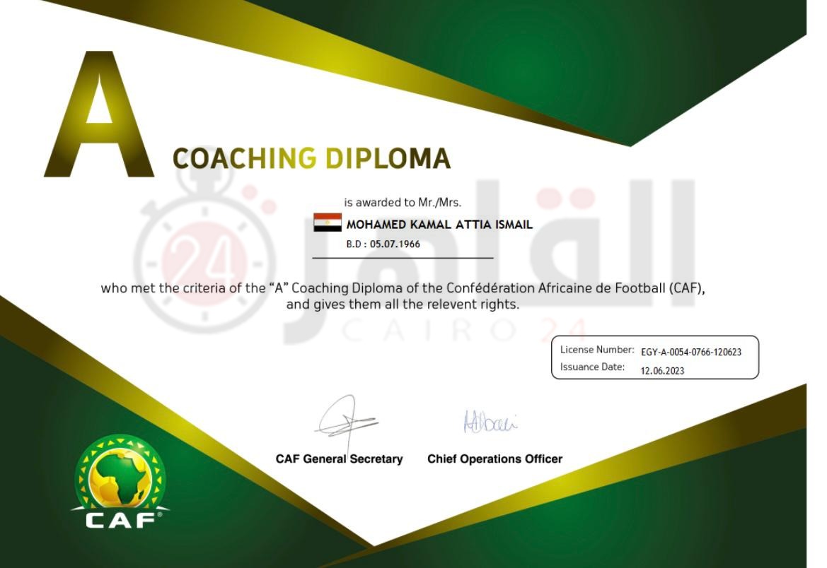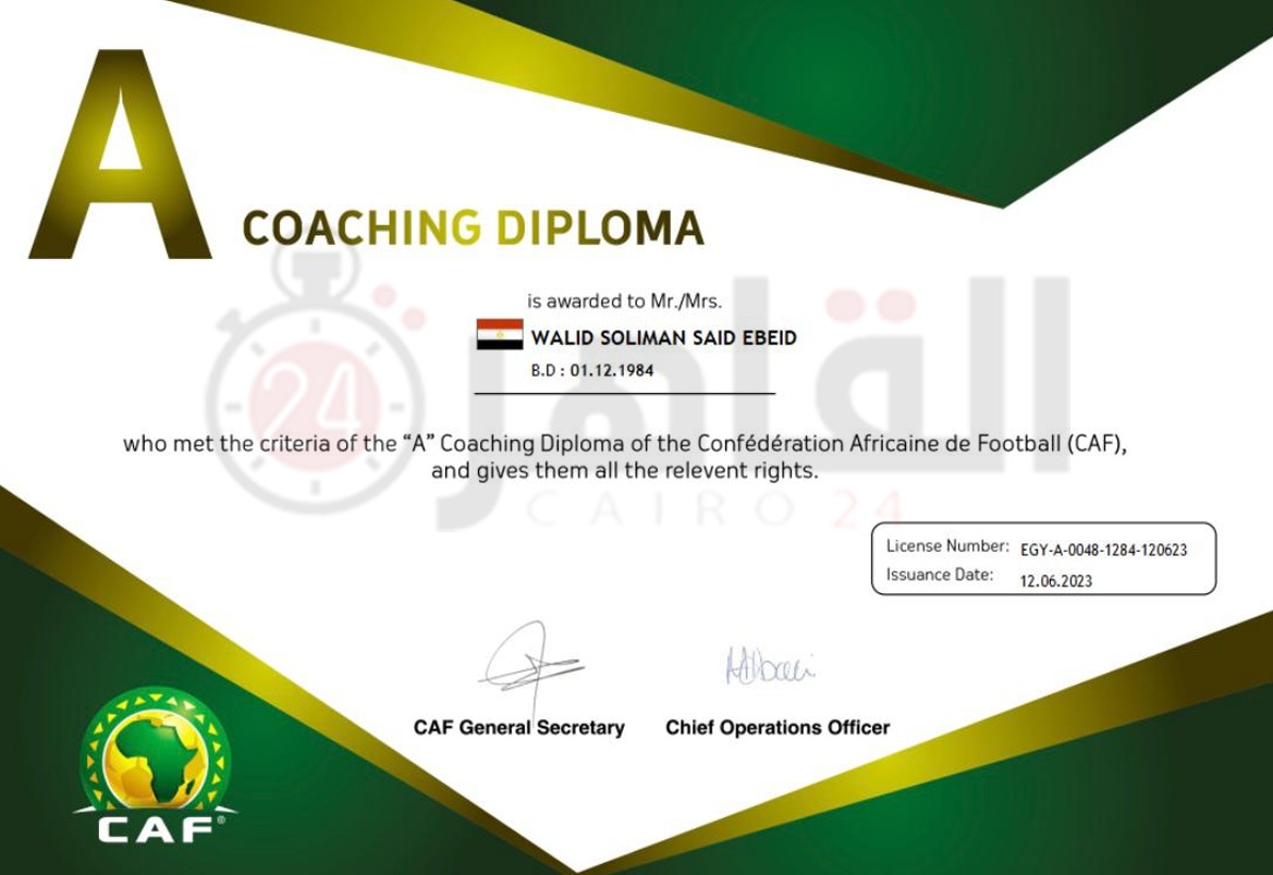أرسل الاتحاد الإفريقي لكرة القدم كاف شهادات الرخصة التدريبة A لـ 25 مدربًا مصريًا، وذلك بعد اجتيازهم الاختبارات الخاصة بدورة الرخصة التدريبية A، والتي أقيمت في مصر خلال الفترة من مارس وحتى يونيو العام الماضي.