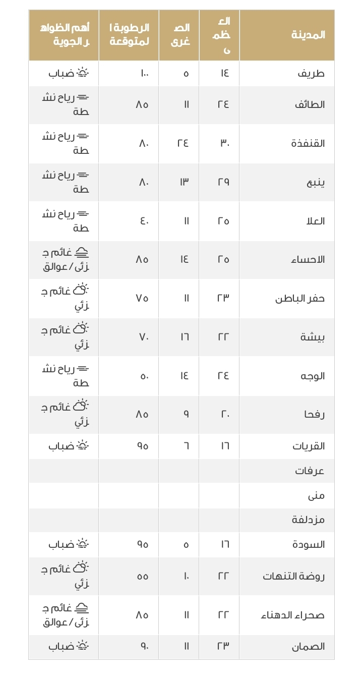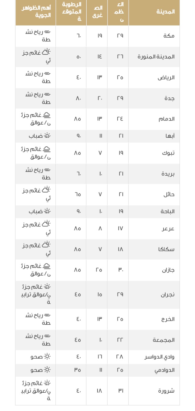 وأوضحت النشرة الجوية درجات الحرارة في السعودية اليوم كالتالي: