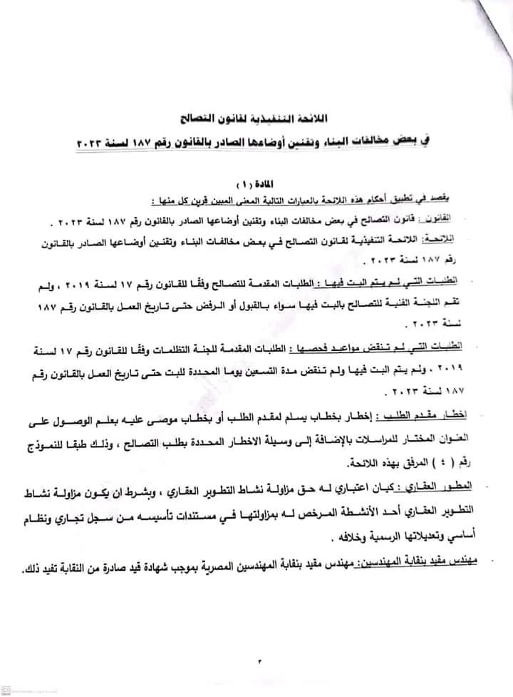 حصل القاهرة 24، على نص اللائحة التنفيذية لقانون التصالح التي سيتم تطبيقها على قانون التصالح رقم 187 لسنة 2023.