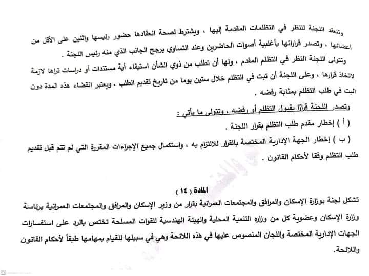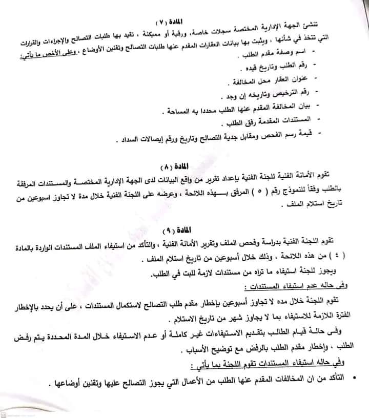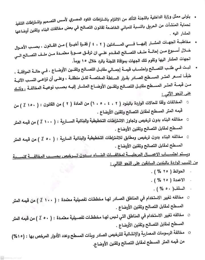 وجاء في نص المادة الثالثة، أنه سيتم تشكيل لجنة فنية أو أكثر، من العاملين بالجهة الإدارية المختصة أو من غير العاملين بها، بقرار من السلطة المختصةللبت في طلبات التصالح، تكون برئاسة مهندس متخصص في الهندسة المدنية أو المعمارية خبرة لا تقل عن 15 سنة أو مهندس استشاري بالنسبة لغير العاملين بالجهة الإدارية المختصة، بحسب الأحوال، وبعضوية كل من: اثنين على الأقل من المهندسين المقيدين بنقابة المهندسين أحدهما متخصص في الهندسة المدنية والآخر في المعمارية، ولا تقل خبرتهما عن خمس سنوات، وممثل عن وزارة الداخلية، ترشحه إدارة الحماية المدنية المختصة وللجنة أن تستعين بمن تراه لمعاونتها في إنجاز أعمالها، ويكون للجنة أمانة فنية يصدر بتشكيلها قرار من رئيس الجهة الإدارية المختصة على أن تكون منالعاملين بالجهة الإدارية.
