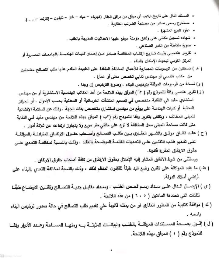 اللائحة التنفيذية لقانون التصالح.. تعرف على المستندات المطلوبة لتقديم الطلب ورسوم الفحص