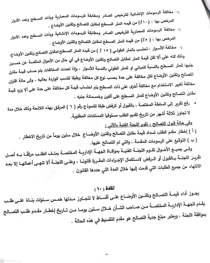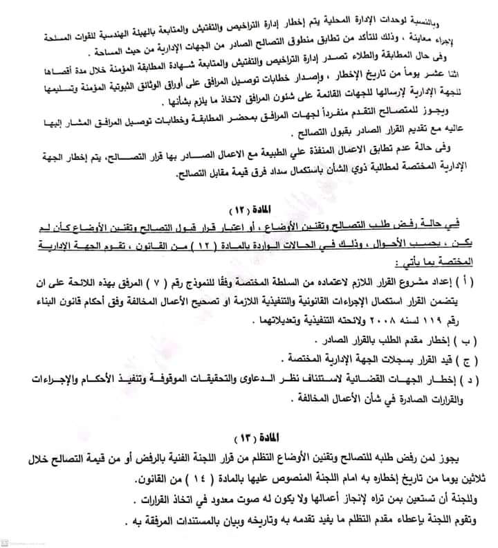وجاء في نص المادة رقم 2، أن السلطة المختصة ستصدر خلال شهرين من صدور تلك اللائحة قرارا بضوابط محددة لقبول التصالح في حالات تغيير الاستخدام في المناطق التي لا يوجد لها مخططات تفصيلية معتمدة بمراعاة الاستخدام السائد في المنطقة وعرض الشارع.