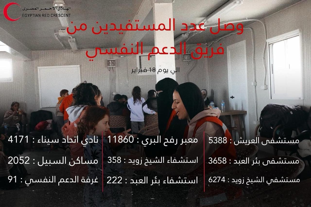 وأوضحت جمعية الهلال الأحمر المصري، أن عدد المستفيدين من الدعم النفسي بمعبر رفح البري وصل إلى معبر رفح البري 11860 مستفيدا، ونحو 5388 في مستشفى العريش، بالإضافة إلى 3658 شخصا في مستشفى بئر العبد، بجانب 6274 فردًا في مستشفى الشيخ زويد و358 باستشفاء الشيخ زويد أما استشفاء بئر العبد وصل عدد مستفيدي الدعم النفسي فيه إلى 222 مستفيدًا.