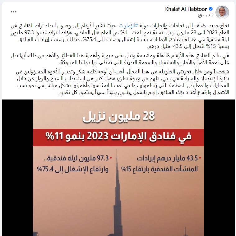 وقال رجل الأعمال الإماراتي خلف الحبتور، في منشور له عبر صفحته الرسمية بموقع التواصل الاجتماعي فيسبوك: نجاح جديد يضاف إلى نجاحات وإنجازات دولة الإمارات، ففي عالم الفنادق هذه الأرقام مُذهلة ومشجعة وتدل على حيوية وأهمية هذا القطاع، والأهم من ذلك أنها تدل على نعمة الأمن والأمان والاستقرار والسمعة الطيبة التي تحظى بها دولتنا المبروكة.