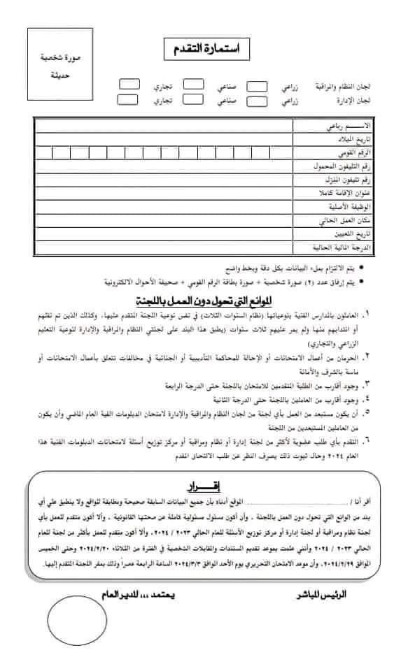وأوضحت وزارة التربية والتعليم، أنه يتم توقيع إقرار للمتقدم للمشاركة في لجان النظام والمراقبة بامتحانات الدبلومات الفنية وهي:
