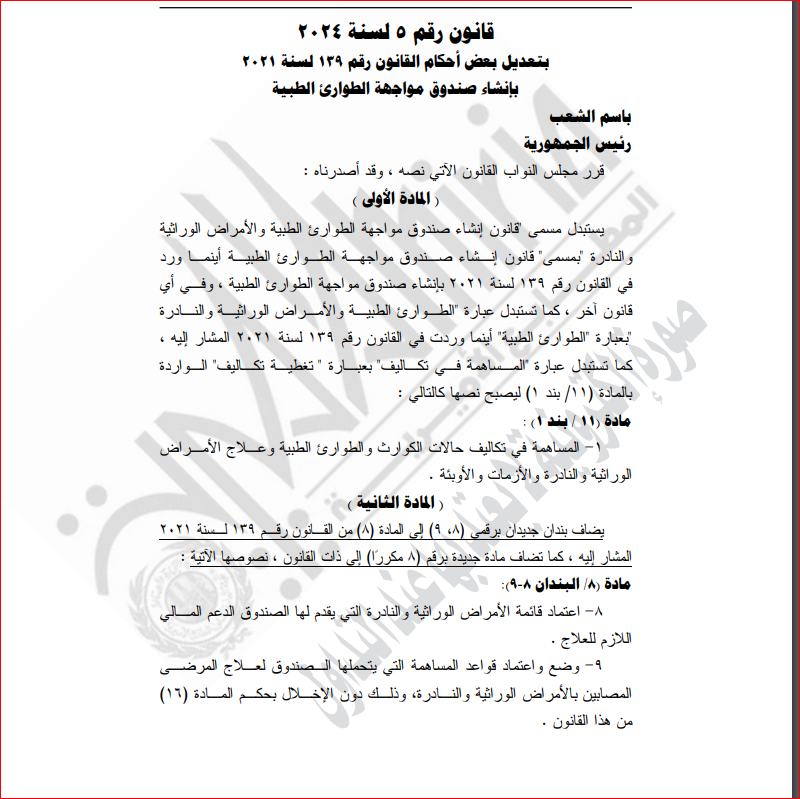 كما تستبدل عبارة الطوارئ الطبية والأمراض الوراثية والنادرة بعبارة الطوارئ الطبية أينما وردت في القانون، كما تستبدل عبارة المساهمة في تكاليف بعبارة تغطية تكاليف.