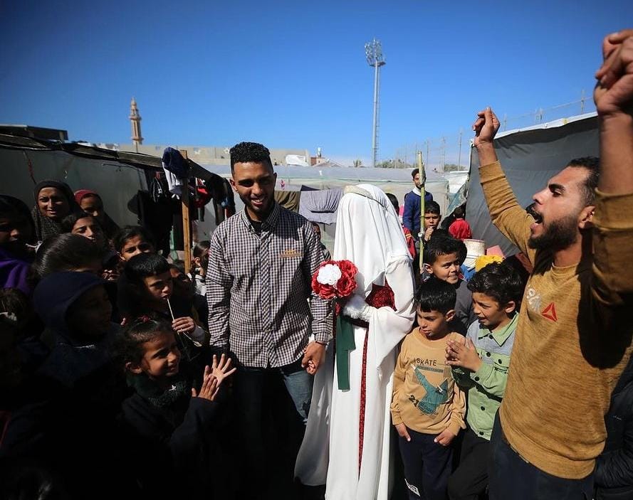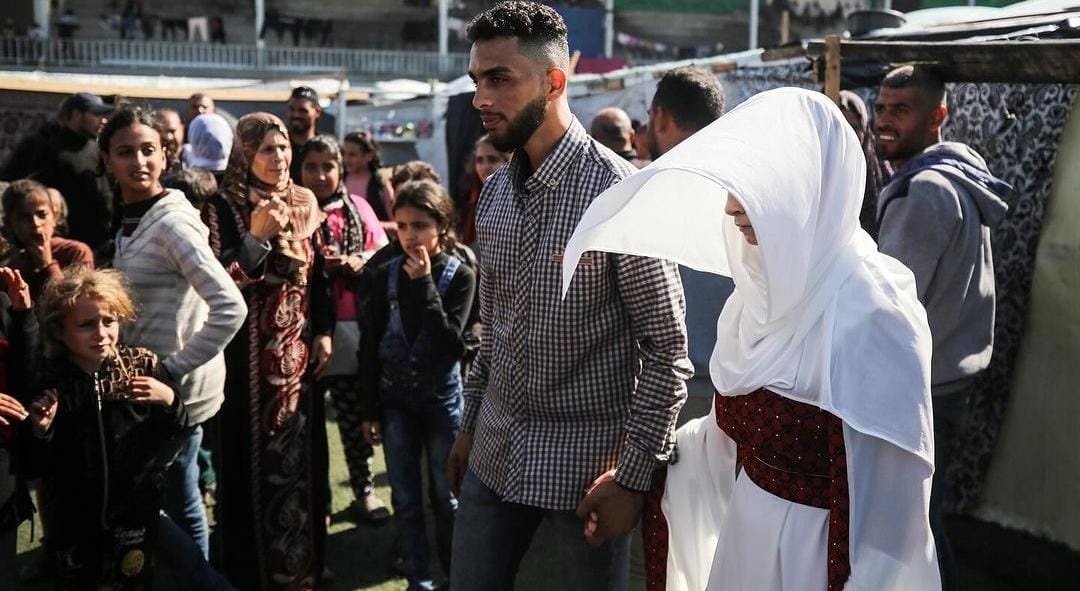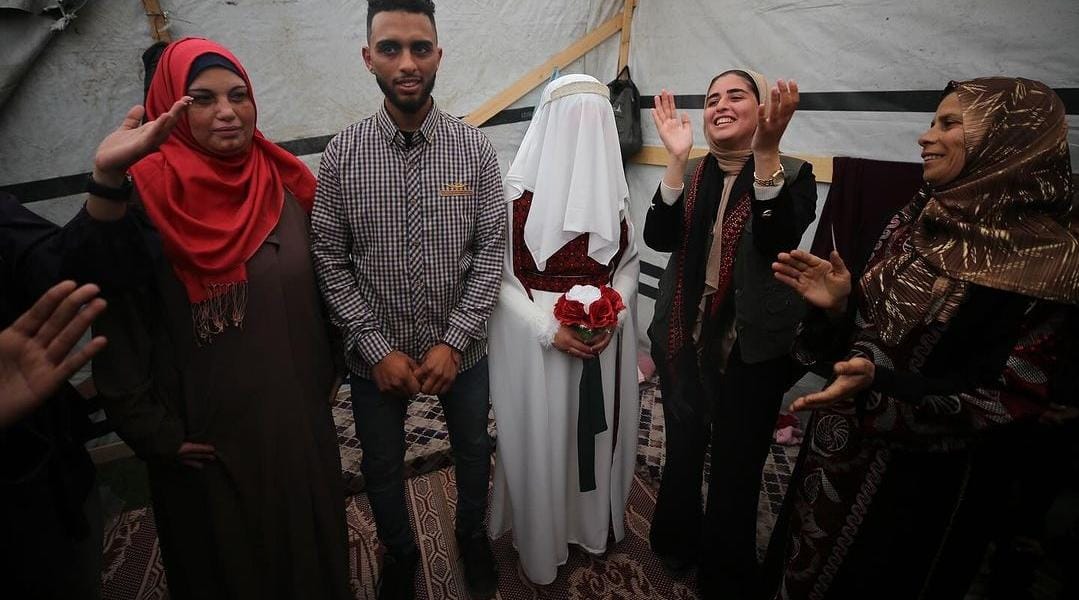 هز مشهد محمود وشيماء، العروسان النازحان اللذان أقاما عرسهما في خيمة بدير البلح، مواقع التواصل الاجتماعي، بعد أن أظهرا مثالا حيا للحب الذي ينبت في أصعب الظروف، ولم تستطع الحرب أن تقف عائقا أمام تكليله بالزواج.