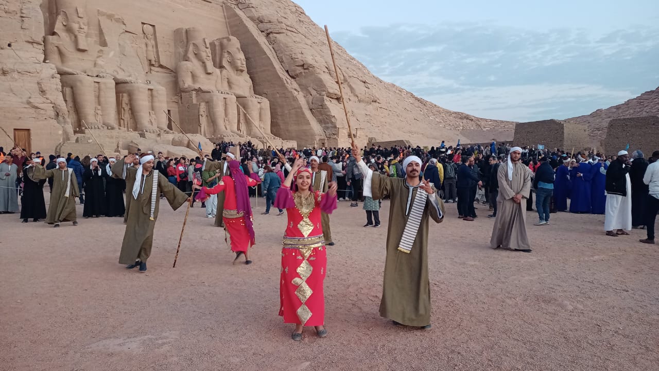 فرق مهرجان أسوان تحتفل بتعامد الشمس بمعبد أبو سمبل